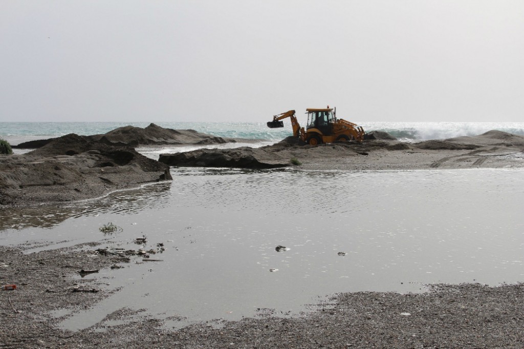 Máquina del Ayuntamiento de MOtril trabajando en la salida de agua en la playa de Poniente